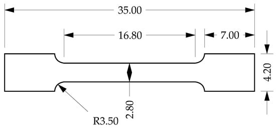 Technical drawing of the specimens used in tensile testing, lengths in mm. Scaled from type H geometry of [].