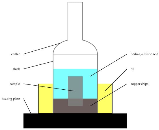 The corrosion tests were conducted on the basis of DIN EN ISO 3651-2 (Strauss test) []. Prior to the tests, the surfaces of the samples (dimensions 100 × 40 × 0.8 ) were ground down to 180 grit size using silicon carbide (SiC) paper. The samples were contacted with copper chips on the bottom of the glass flask and immersed in a boiling solution of 138 HSO ( = 1.84 −1) and 75 dissolved in desalinated water to a total solution volume of 750 . The samples were then exposed to the corrosive environment for a duration of 10 and 20 , respectively. This allowed for a temporally-resolved characterization of IGC. Two samples of one type of FSS were tested simultaneously in a glass flask. A schematic representation of the setup for IGC testing can be seen in Figure 4.