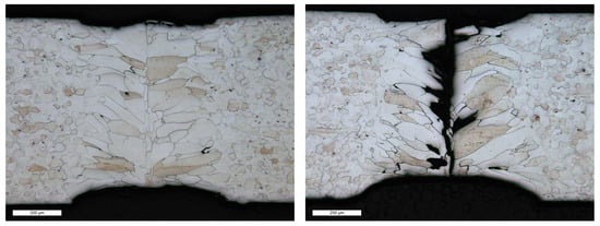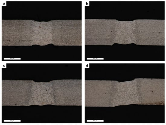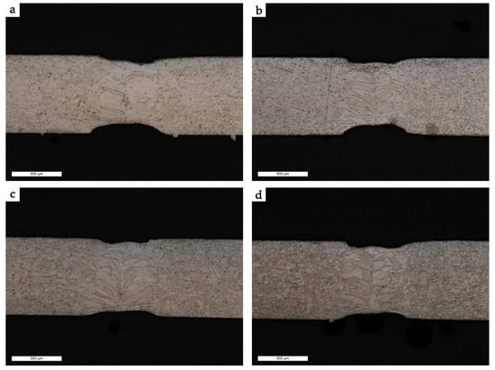 The macrostructures of the weld seams obtained for AISI 430 are depicted in Figure 5. As can be derived from the etched macrographs, the clamping device enabled a reproducible fixation of the thin sheet material with almost no linear offset. For all shown cross-sections, the weld seams exhibited minimal undercutting at the upper surface of the unstabilized FSS regardless of the welding energy input employed. The weld roots, on the other hand, indicated the influence of energy input to their respective shapes, as incursions of the root were decreased with energy inputs of 22 −1 and 24 −1.