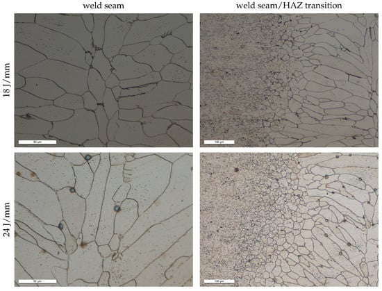 Impartial from the energy input, however, grain coarsening could be observed within the fusion zone, as was expected from the results of Evin et al. []. Through comparisons with the results of the authors mentioned beforehand, it became evident that the grain growth in the present investigation was not as prominent, which may be attributed to the different energy inputs used, yet the alternating energy inputs in the present investigation yielded different widths of weld seam and HAZ. The narrowest weld seam and HAZ could be observed with energy inputs of 18 −1, while a minimal increase of both widths was to be perceived with increasing energy input. Even at an energy input of 24 −1 though, the difference in weld seam and HAZ width might be described as minimal.