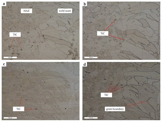 Whereas a large number of rectangular TiC precipitations could be observed in the base material, only a very limited number of these rectangular TiC precipitates were to be found within the weld seam, and some could be identified within the HAZ. This supports the theory that very low heat input welding processes, such as laser welding, might effectively hinder the precipitation of stabilizing carbides such as TiC to a certain degree in the first, rapid cooling segments following solidification. Yet, through the contrasting grain boundaries of the etched micrographs, as were to be seen with AISI 430, the authors propose that the precipitation of some very fine carbides occurred. For once, these precipitates were found in the border area of weld seam and HAZ, but more dominantly, they were to be found within the weld seam itself, which resulted in strongly contrasting grain boundaries, as can be seen in Figure 8. For this reason, it was concluded that ferrite-forming Ti in solid solution enabled a fully ferritic solidification with a body-centered cubic lattice (bcc), in which, on the other hand, less carbon was soluble as compared to a face-centered cubic lattice (fcc). As a result, the bcc lattice in the weld seam was supersaturated in carbon, and thus induced carbide precipitation at the grain boundaries of the weld seam. The exact chemical composition of the carbides could not be determined, but it was assumed that both TiC and were precipitated at the grain boundaries during the corresponding thermal cycle of laser welding. These observations are in agreement with those postulated by Bäumel [], who identified that the behavior for GTAW of 17 wt.% Cr FSS with Ti-stabilized 17 wt.% Cr FSS as filler material.