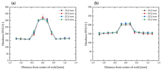 Hardness measurements of (a) AISI 430 and (b) AISI 430Ti welded at varying energy inputs. Mean values and standard error of the mean (SEM) calculated from three different measurements.