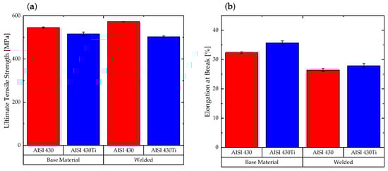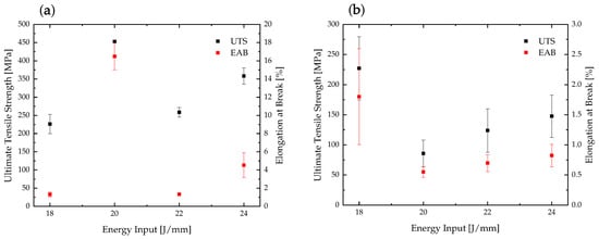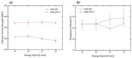 Despite the different macroscopic characteristics of the weld seams, the joints of each respective material exhibited similar mechanical properties. Firstly, for AISI 430, no distinct variation of the ultimate tensile strength (UTS) could be perceived for varying energy inputs, as can be seen in Figure 10. Moreover, it was to be observed that the elongation at break (EAB) only exhibited negligible variations upon a change of energy input. A similar behavior was identified for the specimens of AISI 430Ti, which did not reveal any distinct changes in UTS or EAB with regard to energy input.