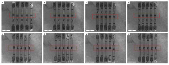 Photographic images of fractures in tensile specimens of (a–d) AISI 430 and (e–h) AISI 430Ti welded at different energy inputs (left to right: 18 −1–24 −1). Weld seam area marked with red rectangles.