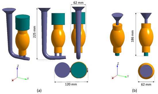 (a) 3D model for binder jetting (BJ) gravity-pouring casting system. (b) 3D model for BJ vacuum-assisted casting system.
