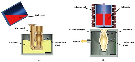 Diagram of the casting process: (a) gravity-pouring technique, (b) vacuum-assisted technique.