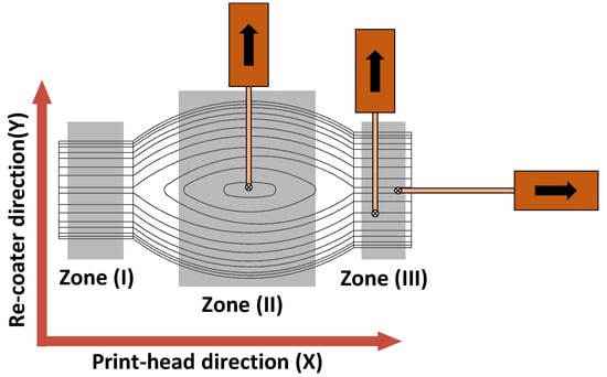 The surface quality of the parts was obtained using a Mitutoyo Surftest SJ-500 profilometer (Mitutoyo, Kawasaki-shi, Japan). The cutting length was 2.5 mm and the evaluation length 12.5 mm, according to ISO 4288: 1996 []. The measurements were taken in three areas of the part, designated as Zone I, II, and III. In Zones I and III, the measurements were made in two directions: (i) in the direction of the print-head (X direction) and (ii) in the direction of the movement of the re-coater (Y direction). Zones and directions are shown in Figure 6. The measurements made in the Y direction registered surface irregularities due to the staircase effect characteristic of the 3DP technique. In Zone II, only measurements in the Y direction were made.
