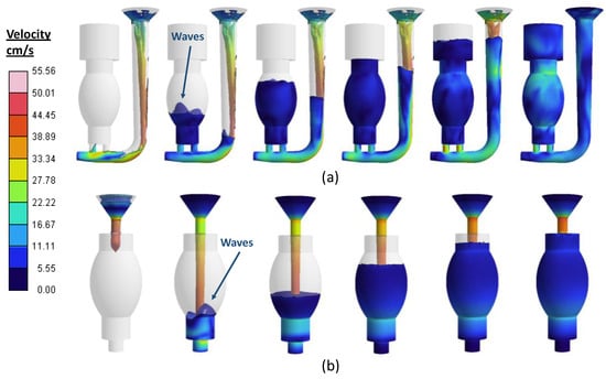 The behaviour of the liquid flow for the vacuum-assisted mould was more stable and homogeneous (Figure 7b). In the early stages of the filling process, the liquid entered the mould cavity at a high velocity; this was due to the vertical pouring configuration of the mould. The initial jet impact generated a turbulence, which was absorbed by the overflow. A slight wave effect was produced, but this effect was mitigated by the suction forces applied by the vacuum. Subsequently, a uniform filling process was obtained. The filling time in this case was 1.9 s.