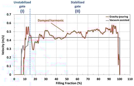 Stage (ii) represents the filling process when the metal liquid was stabilized at the gate. As shown in Figure 8, the gravity-pouring mould showed a filling with fluctuations over an average value of 0.48 m/s. The initial source effect dragged these fluctuations during the filling process. In addition, a damped harmonic state was observed in which the flow-generated waves decreased in amplitude as the filling process was completed. This is consistent with Figure 7a, where waves generated by the source effect tended to decrease and the flow became more stable. High runner pressures and large areas in the cavity result in higher gate velocities [,]. Even so, only in specific cases did the average velocity exceed the critical value of 0.5 m/s. Therefore, there was low risk of gas entrapment.