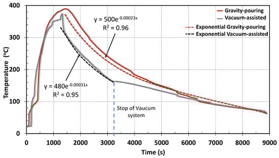 As can be seen in Figure 9, the exponent of the equation was higher in the vacuum-assisted mould, therefore the vacuum-assisted cooling was quicker than for the gravity-pouring mould. The higher thermal dissipation was due to the vacuum suction, as it removed the hot gases that were generated during the casting process, evacuating a higher heat flow. In addition, the proximity of the hot runner in the gravity-pouring casting could prevent the heat evacuation. Therefore, the turning point on the curve and the subsequent cooling process in the vacuum-assisted mould occurred earlier.