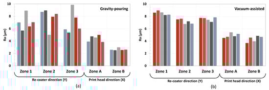 The gravity-pouring part had an average value of Ra = 3.52 µm in the direction of the printing-head movement (X direction) and Ra = 7.02 µm in the re-coater direction (Y direction). The average roughness values of the vacuum-assisted part were Ra = 4.63 µm in the X direction and Ra = 7.76 µm in the Y direction.