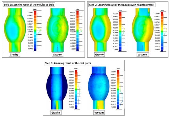 As shown in Figure 11, step 1 reflects the comparison between the as-built mould cavity and the nominal CAD. The gravity-pouring mould showed a low standard deviation (0.087 mm). The measured values indicated results very close to the nominal (0 value). For the upper points (55.52%) the average value did not exceed 0.07 mm. The lower points (44.48%) also had an average value of −0.07 mm. On the other hand, vacuum-assisted mould showed an even smaller standard deviation (0.054 mm). Moreover, the average values are even closer to the nominal values, 0.04 mm for the upper (46%) and lower (54%) points, respectively. Therefore, both moulds have a similar accuracy, with a standard deviation around ±0.05 mm, which indicates that the AM machine has a good geometrical accuracy and high repeatability during the manufacturing process.