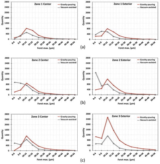 The following can be deduced: (i) the pore size is in general between 10 and 14 μm for the gravity-pouring casting and between 0 and 14 μm for the vacuum-assisted casting. Therefore, the vacuum pressure decreases the pore size. (ii) The number of pores diminished in all areas with the vacuum-assisted casting. (iii) For both parts, the number of pores increased in Zones II and III, as explained in the previous paragraph. On the other hand, Figure 12 reveals that the number of pores increased on the outside of the parts regardless of the zone. The reason is that the gas entrapped by the metal liquid could not be evacuated before solidification. Preheating of the mould is recommended to avoid this phenomenon.