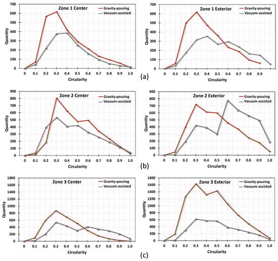 Circularity in the vacuum-assisted part increased in all zones and locations. Therefore, it can be stated that when the size of the pores decreases, the circularity increases. In contrast, the larger pores had more irregular shapes, due to the defects associated with contraction by solidification, among others. The circularity of these particles was very low. Finally, the trend in morphology is very similar in all the analysed samples. For the gravity-pouring part, the circularity is grouped around 0.3; this indicates sharper and more irregular pores. However, for the vacuum-assisted part, the circularity tends to be higher (0.6), indicating more rounded pores.