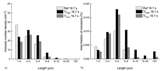 The size distributions of all inclusions in the t8/5 = 16.7 s samples are presented in Figure 1. The majority of inclusions in the Ref sample were small 1–2 μm, while in Tihigh there were higher fraction of coarser inclusions (length > 2 μm). This is shown especially well in Figure 1b, wherein the inclusions are presented as area fractions. The larger area fraction of coarser particles is explained by the differences seen in the total oxygen content between the samples. The Al-deoxidized Ref had an oxygen content of 23 ppm, whereas the Ti-deoxidized steels had 47 and 80 ppm. The inclusion size distribution in Ref was close to that of Tilow but the average size was slightly larger in Tilow.