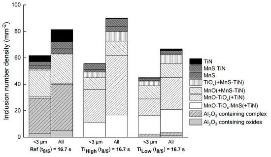 Figure 2 presents the number densities of different class of inclusions in the t8/5 = 16.7 s samples according to the classification scheme used. It can be clearly seen that the majority of the inclusions in Tihigh and Tilow were TiOx-containing, while inclusions containing considerable amounts of TiN (i.e., TiN or MnS TiN classes) were common only in the Ref and Tihigh samples. A high number of Al2O3-containing inclusions in the Ref sample indicates that the most common inclusions were different than in the other two steels, as was also pointed out in Table 2.