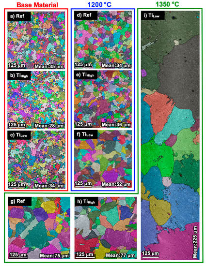 Reconstructed prior austenite grains with the mean prior austenite grain size of base materials of Ref (a), Tihigh (b), and Tilow (c); with Tp = 1200 °C, held for 5 min, and water quenched Ref (d), Tihigh (e), and Tilow (f); and with Tp = 1350 °C, held for 2 min, and water quenched Ref (g), Tihigh (h), and Tilow (i). Images are from TD-ND surface of the samples, so possible elongation regarding the rolling direction is not visible. Note that in (i) an area matrix of 1 × 6 was combined to one image to capture some grain boundaries.