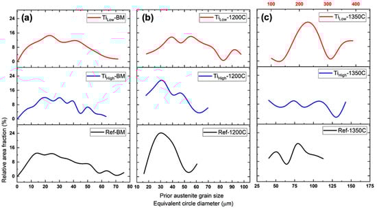 (a) Prior austenite grain size distribution of base materials; (b)simulated HAZ with Tp = 1200 °C, held for 5 min and water quenched; (c) and simulated HAZ with Tp = 1350 °C, held for 2 min, and water quenched. Note the differences in the x-axis. The x-axis for the Tilow −1350 °C is given in red on the top of the chart.
