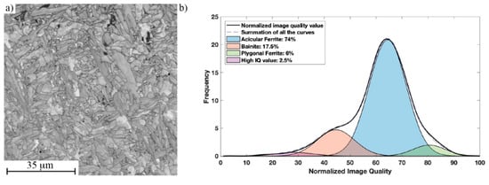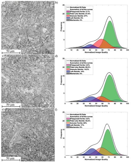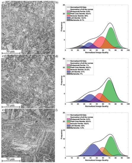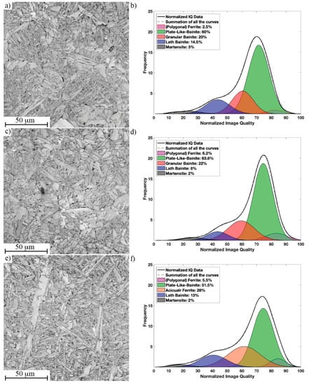To accurately characterize and quantify the complex CGHAZ microstructures, EBSD image quality (IQ) analysis was used. As different morphologies vary in intrinsic dislocation density and give different IQ values [], the normalized IQ data were analyzed on the basis of previous work by DeArdo []. In this method, the normalized IQ histogram was deconvoluted into multiple peaks with a normal distribution and then the ratio of area under each peak to the area of IQ curve was considered as a fraction associated with each morphology or phase.