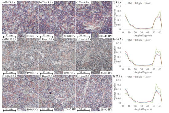 Misorientation distribution of Tilow differed from the other steels, as seen in Figure 9. The misorientation distribution of Tilow resembled that of AF presented in a previous study [], especially in cases with t8/5 = 16.7 s and 23.8 s. In Ref and Tihigh the misorientation distributions were comparable with each other. Figure 9 presents the microstructures and the HV10 hardness of each scenario. With t8/5 = 4.8 s the average HV10 hardness in Tilow was notably higher (280) than in the other two. Potentially, this might be a result of an increased hardenability due to coarse PAGS, as was seen, e.g., in Figure 3i and increased lath-like bainitic features seen in IQ analysis. However, as the prior IQ analysis shows, the fraction of martensite was not seen to increase. Another factor improving hardenability in Tilow compared to other steels was higher silicon content (0.23% vs. 0.01% and 0.03% in Ref and Tihigh, respectively). With longer cooling times the differences in hardness diminished, but the trend remained, i.e., the Ref was the softest and Tilow the hardest (p < 0.05, one-way ANOVA).