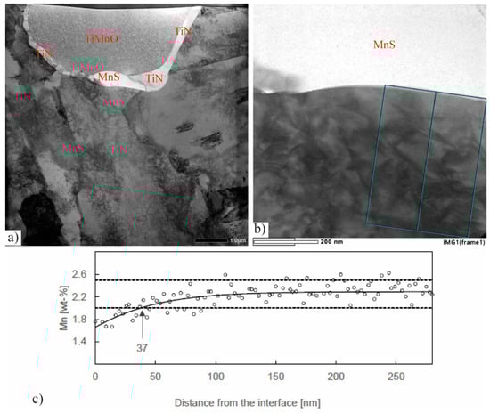 The main aim of the TEM study was to measure the Mn content at the interface between the steel matrix and MnS. Figure 10b presents the line whereat the Mn was measured using EDS, and Figure 10c shows how the Mn content gradually decreased from approximately 2.2 wt.% to 1.7 wt.% during the distance of about 50–60 nm. Taking into account the scattering of the data, the depletion depth in this instance was about 37 nm from the interface (the point in which the fitted trendline deviated outside the two standard deviations of the bulk). It was noticed that the bulk Mn content was different in EDS as compared to bulk material OES in Tilow. The difference was assumed to come from local segregation of Mn and differences in analysis techniques.