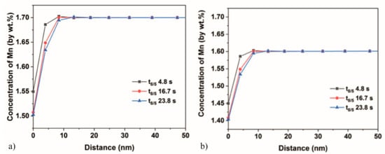 The concentration profiles of Mn across the MnS–austenite matrix interface for the considered cooling times to simulate CGHAZ in this study was calculated. These depletion profiles are shown schematically in the Figure 11, from the interface of MnS–austenite and into the austenite matrix. The concentrations at zero nm indicate the Mn composition at the interface in austenite matrix. The profiles in Figure 11a were obtained after a cooling from 800 to 500 °C (t8/5) of 4.8, 16.7, and 23.8 s. A clear depletion of Mn was observed, and the depletion width increased with an increase in t8/5. This in turn may explain, partly, the increase of the AF fraction in the CGHAZ of Tilow with increasing cooling time, as was presented in Figure 5, Figure 6 and Figure 7; the driving force for the ferrite formation is known to increase along with decreasing Mn content. Similar observations have been achieved previously, e.g., in [,,,]. The depletion of Mn is in the nm range for the considered conditions. However, the alloy might consist of Mn-depleted regions prior the start of simulations, and because of this, calculations were also performed assuming an initial drop of Mn to 1.6 by wt.% at the interface. These are shown in Figure 11b. The depletion of Mn increased in width, although still remaining in the nm range. These results suggest the presence of Mn depletion and estimating approximate widths and are in conjunction with that seen from the TEM measurements.