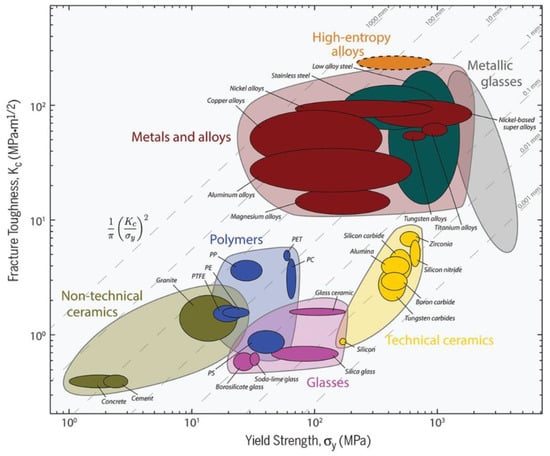 An Ashby plot that compares the fracture toughness and yield strength of HEAs with several other materials and bulk metallic glasses (reproduced from Reference [] with permission).