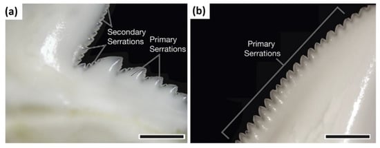 High-magnification light micrographs of the (a) primary and secondary serrations of the distal heel of the Galeocerdo cuvier shark tooth (scale bar of 2 mm), and (b) the primary serrations of the cutting edge of the Prionace glauca shark tooth (scale bar of 2 mm) (reproduced from Reference [] with permission).