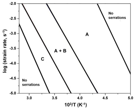 In addition to temperature and irradiation, strain rate can also affect the serrated-flow behavior [,,,,]. Typically, the critical strain for the onset of serrations increases with an increase in the strain rate []. However, there are cases where the critical strain will also increase with a decreasing strain rate []. In this scenario, the increase in the critical strain is due to an increase in the strength of solute obstacles, which reduces the ability of solutes to migrate and pin dislocations. Robinson et al. reported the dependence of the serrated flow during Lüders-band formation on the strain rate (as well as temperature) in an Al-5Mg (at.%) alloy []. The results of this study can be observed in Figure 12, and as can be seen, Type-C serrations tended to occur at higher temperatures, while Types A and B were found at lower temperatures. Furthermore, the strain rate at which a transition in the serration type occurred, i.e., Type-A to Type-A + Type-B transition increased with an increase in the temperature.