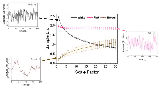 Mean sample entropy of the colored noise data and 1 ≤ τ ≤ 30 plotted with the colored noise plots for brown (β = 2), pink (or 1/f with β = 1), and white (β = 0) (adapted from Reference []).