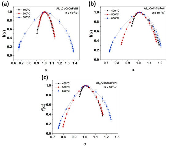 It is important to note that, typically, the limits from Equations (13) and (14) cannot be calculated directly, and instead a linear-regression analysis must be implemented. A plot of f(α) vs. α is known as the multifractal spectra and is typically characterized by a parabolic shape. The width of the multifractal spectrum, which is defined here as Δ = αmax − αmin, measures the signal heterogeneity and is associated with the dynamical heterogeneity of the serrated flow [].