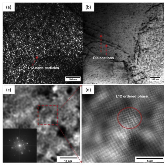 Furthermore, the random distribution of elements (and lattice-potential energy) in the alloy may also be a contributing factor to the sluggish diffusion of atoms and vacancies to lattice sites of lower energies [,]. This sluggish diffusion effect results in the potential beneficial properties of slower grain growth [], exceptional elevated-temperature stability [], high-temperature strength [], and a higher recrystallization temperature. However, there is still some debate regarding the validity of the sluggish-diffusion concept [,,,,].
