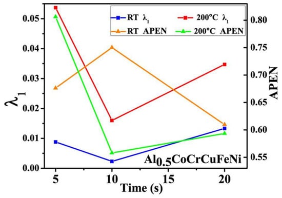 Entropy-based complexity measurements have been employed to analyze a host of different fluctuating phenomena, including financial-time series, biological signals, and time-dependent serrated-flow behavior during mechanical testing [,,,]. In the present context, entropy increases with the degree of disorder (or irregularity) and is the maximum for completely random systems []. With respect to the serration behavior in HEAs, higher values are attributed to more complex dynamical behavior during the serrated flow. For biological systems, the complexity of physiological signals is related to the ability of a living system to adjust to an ever-changing environment []. For instance, a relatively lower complexity measure has been attributed to pathological conditions, such as the congestive heart failure [,,]. Applying the above ideas to material systems, the complexity of the serrated flow may be a measure of a material’s ability to adapt to an applied load [].