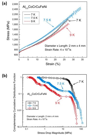 This type of modeling and analysis has been proven to be a useful tool in the analysis of serrated flows in HEAs. Zhang et al. applied the MFT-modeling technique to examine the effect of temperature on the weak spot (dislocations) avalanche dynamics in HEAs []. Carroll et al. employed the MFT model to analyze the serrations that were exhibited by low-, medium-, and high-entropy alloys []. Results indicated that the serration-type change from Type-A to Type-B to Type-C with an increase in the temperature. It was also reported that an increase in the strain rate corresponded to a transition from Type-C to Type-B to Type-A serrations in the HEAs.