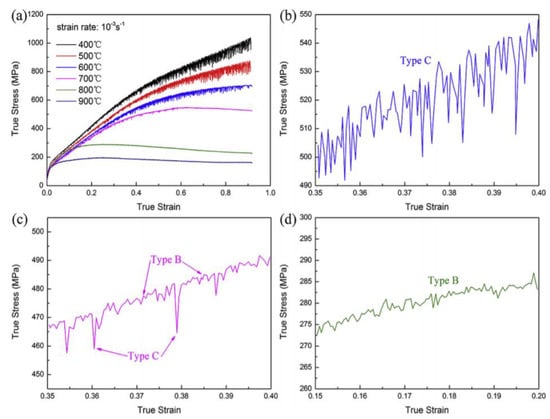 Several mechanisms can contribute to the serrated flow in materials during mechanical deformation, including the dislocation pinning by solute atoms, mechanical twinning, grain boundaries, order–disorder phase transformations, phase transformations induced by stress and strain, and yielding across fracture surfaces in brittle materials [,,,,]. In terms of dislocation pinning by solute atoms, both interstitial and substitutional solutes can participate in the dislocation-pinning process. With respect to interstitial solute pinning, Cottrell and Bilby provided one of the earliest theoretical explanations for this phenomenon []. In their work, they suggested that at sufficiently high temperatures interstitial solute atoms (such as C or N) diffuse toward dislocation cores, where they impede their motion []. As mentioned above, substitutional solutes can also participate in dislocation pinning. Here, substitutional solutes diffuse via a vacancy mechanism during plastic deformation []. Solute atoms that are larger than the parent metal diffuse below the dislocation line, where the strains are tensile []. On the other hand, solutes that are smaller than the matrix atoms migrate to sites above the dislocation line, where compressive strains occur. Consequently, these strain fields pin the dislocation in place. Once the stress becomes sufficiently large, the dislocation can break free and then migrate until it is pinned again. If the pinning and unpinning processes are repeated cyclically, it leads to a DSA effect [].