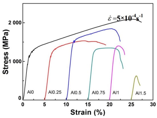 It is widely accepted that, in HEAs, any atom can act as a solute atom []. However, there are cases in which only certain atoms in the matrix can participate in dislocation locking. In fact, some investigations have revealed that only certain additives such as Al may hinder dislocation motion in HEAs during deformation [,,]. For instance, Yasuda et al. compared the mechanical behavior of Al0.3CoCrFeNi and CoCrFeNi HEAs during DSA []. It was reported that the Al-containing HEA exhibited serrations, whereas the latter specimen did not. It was hypothesized that the creation of Al-containing solute atmospheres near a moving dislocation core results in an increase of the frictional stress on the dislocations, thus resulting in serrations. Niu et al. also found a similar trend when investigating the DSA in Al0.5CoCrFeNi and CoCrFeNi HEAs []. In a study of carbon-doped CoCrFeMnNi HEAs, serrated flows at room temperature (RT) occurred due to interactions between carbon impurities and dislocations, as well as an increase in the stacking fault (SF) energy due to the presence of the carbon [].