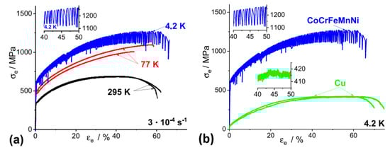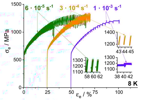 - Tirunilai, A.S.; Sas, J.; Weiss, K.-P.; Chen, H.; Szabó, D.V.; Schlabach, S.; Haas, S.; Geissler, D.; Freudenberger, J.; Heilmaier, M.; et al. Peculiarities of deformation of CoCrFeMnNi at cryogenic temperatures. J. Mater. Res. 2018, 33, 3287–3300. [Google Scholar] [CrossRef]