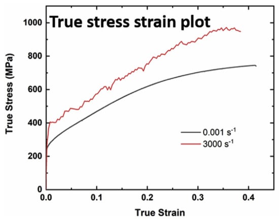 The serration behavior can be affected by factors such as the composition, temperature, irradiation damage, and strain rate. For example, Cai et al. [] observed that, in Ni-based superalloys, the γ′ precipitates could lead to the aggregation of solute atoms around moving dislocations, thereby enhancing serrations in the material. Similarly, Chandravathi et al. found that the serration behavior in a 9Cr-1Mo steel was also born out of DSA, as the serrated flow was observed in all variations of microstructures, except in certain conditions where increased soaking temperatures above 1423 K led to elevated hardness due to the larger austenitic grain size []. Bayramin et al. determined that microstructure played a primary role in the serration behavior of a dual-phase low-carbon steel []. They found that the DSA was more pronounced in a sample with a higher concentration of the ferrite phase present. From the results, they hypothesized that the pronounced DSA was attributed to a dislocation density, which increased with increasing strain, such that the dislocation pinning was more prevalent in the ferrite microstructures. Such behavior has been observed in prior studies [,,].