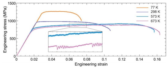 (a) Tensile curves for the unirradiated annealed V-4Cr-4Ti at a strain rate of 10−3 s−1 and (b) tensile curves for V-4Cr-4Ti irradiated to 0.5 dpa at 110–420 °C and to 0.1 dpa at 505 °C. The curves were offset on the strain axis for clarity (reproduced from Reference [] with permission).