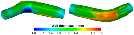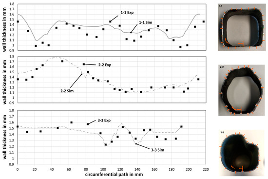 For comparison, the average hardness of a furnace-heated straight demonstrator of the same material is supplemented (striped bar in the diagram, Figure 8), compare DP3 in [11]. A minimum hardness of 540 HV was verified for all component areas. When converted according to DIN EN ISO 18,265, this value approximately corresponds to a tensile strength of 1775 MPa. This shows that the newly developed process allows for the design and heating procedure HMGF with integrated conductive component heating to be adapted to bent component geometries. Furthermore, the wall thickness of the manufactured component was measured along a circumferential path at the sections 1-1, 2-2 and 3-3 as shown in Figure 8. Figure 10 compares the result of the measurement with the simulation results. Each section is shown on the right with an initial arrow for the start of the measuring path. The curves at the different measurement positions feature different lengths since the cross-sections, and consequently, the circumferences, differ from each other. A good qualitative agreement exists between the respective simulation and real curves. In large parts, the quantitative agreement is also acceptable. Locally there are significant deviations in a range of about 30%, see for example curve 1-1, which may be caused by the inaccurate representation of the friction conditions at the high forming temperatures, which may be assumed as too low, and by the assumption regarding heat transfer. Furthermore, the results of the real tests are strongly influenced by the quality of the semi-finished product with strongly varying wall thickness in some places due to the manufacturing process.