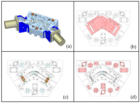 - Guiding elements and force absorption elements, required for the functionality of the forming process, which are highlighted in Figure 4d,