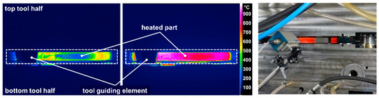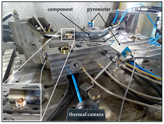 In general, the main application problem is gross cracking of the inserts due to insufficient toughness of the material if thermal shock occurs during the process. However, the mechanical strength of the tools and the leak tightness of the system must be guaranteed at the same time. A minimal distance between cooling channels and mold is required due to this fact. Extensive measurement technology was necessary for the thermal characterization of the component and process control. This measuring technology included a thermal camera, two pyrometers and type K thermocouples with direct measuring functions. The thermal camera (black in the lower part of Figure 5), whose orientation towards the component, provided detailed information about the local temperature distribution in the part at specific moments during the process. This information was used in the process analysis in order to characterize the overall heating behavior of the part and to identify relevant points of the workpiece, where more detailed information was needed and which were most suitable for process control. This measurement was complemented by the thermocouples and the pyrometers, which provided detailed information about the temperature as a function of the time for distinct points of the workpiece. The thermocouples served for analyzing the component heating behavior at six points in different regions of the part. However, due to the mechanical impact, this measurement technique turned out to be not suitable for reliable process control with the complete closing of the tool and the entire forming process. Therefore, contact-free optical measurement via pyrometers was used to control the conduction heating of the component at the two most relevant points.