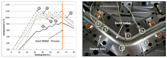 The explanation for this inhomogeneous temperature distribution is the current flow, which follows the shortest possible route through the component due to the smallest electrical resistance. Therefore, the current flow concentrates on the inner radius of the curved part. In order to counteract inhomogeneous temperature distribution and to achieve the required minimum temperature at any point, a suitable pulsed current was applied to the component. In the short time window without power supply in-between two subsequent pulses, areas that are relatively hot compared to their surroundings can dissipate warmth by heat flow into neighboring component areas, whereas regions that are relatively cool compared to their surroundings are heated by nearby hot areas. This results in the balancing of the temperature and in almost homogenous heating of the component to a targeted austenitization temperature of 911 °C. Measurement of the temperature distribution with attached thermocouples proved the suitability of this heating strategy as shown in Figure 7 without the HMGF-step. The thermal sensors 3, 4, 5 and 6 at the beginning and at the end of the pipe (top, bottom, inside and outside) are heated to similar temperature levels. The highest temperature is detected by sensor 1, which is positioned on the inner curve, i.e., directly in the area where the current flows and the resistive heat is generated. Due to the pulsing of the current, the lower temperature at the outer bend of the component (i.e., at thermal sensor 2) raises to austenitization temperature without overheating the other areas. When the thermal sensor at the inner bend (1) reaches the pre-set maximum temperature, the power supply from the conductor is automatically switched off, followed by an interruption of a few seconds. A straight orange line highlights the theoretical start of the HMGF-process after reaching Ac3-point in all part areas. The conducting system has the following four adjustable parameters for controlling the pulsing current: maximum temperature, heating or pulse time, maximum current and pause time. The temperature is measured by the two mentioned pyrometers during the heating process, see Figure 5. Due to the inhomogeneous heating of the component, it was decided to focus one pyrometer onto the inner bend and the other onto the outer bend of the component in order to control the conductor. This was to ensure that the temperature in the faster-heating inner region of the part does not exceed a pre-set maximum temperature and that the outer region reaches the set minimum temperature. Figure 6, right, shows the glowing component in the almost closed tool during the heating process. As mentioned above, the top and the bottom sections of the part are hidden by the tool. First trials at Fraunhofer IWU were carried out to determine the optimized conduction heating process with the focus on reaching the AC3 temperature at any point of the component. Several tests have additionally been done with different currents. With lower current levels compared to the maximum of 2.500 A on the equipment side, only the heating time has been extended too much or the desired temperature has not been reached. Table 2 shows the final corresponding parameters characterizing the ideal heating process.