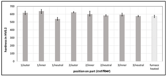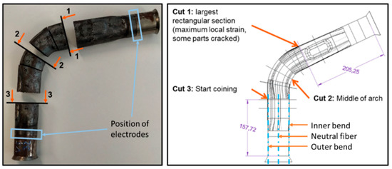 In order to evaluate the quality of the manufactured component and to provide a more detailed verification of the numerical simulation, the parts were characterized considering the distribution of hardness and wall thickness. For this purpose, exemplary components were cut at the three positions marked in Figure 8. The hardness was measured according to DIN EN ISO 6507-1:2006-03 on the outer and inner bend and on the neutral fiber on the cross-sectional area, illustrated by blue dotted lines. Figure 9 shows the results.