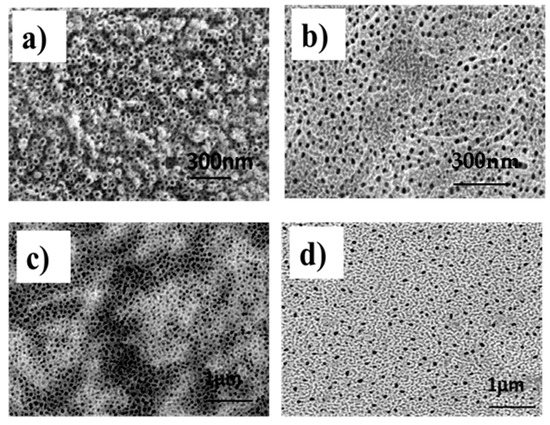 Mechanical properties and surface are important criteria to choosing biomaterial for metal implants. Ti–30Ta alloy shows elastic modulus nearer to bone (E = 69 GPa) when comparing to Ti Cp (E = 105 GPa). The not commercial Ti–30Ta alloy smooth surface corrosion behavior was investigated and presented high corrosion resistance [6]. This word presents five condition named 5 Groups: 1—Ti–30Ta alloy without surface modification, 2—anodized w/o annealing-nanotubes of TiO2 without annealing, 3–450 °C-nanotubes of TiO2 annealed at 450 °C, 4–530 °C-nanotubes of TiO2 annealed at 530 °C annealed and 5–600 °C-nanotubes of TiO2 annealed at 600 °C. In addition, the chemical surface modification was performed to active an attractive surface to cell. The layers of nanotubes are studied in surface modifications because of their chemical stability and structural properties that mimic the human bone. The morphologies of SEM micrographs of Ti–30Ta alloy surface after anodization process in 0.25% NH4F + glycerol at 30 V for 9 h and the annealing process was performed at (a) anodized w/o annealing, (b) 450 °C, (c) 530 °C and (d) 600 °C (5 °C/min) for 1 h are shown in Figure 1.