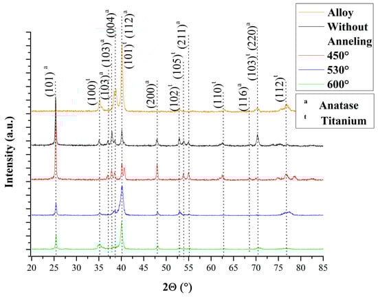 The crystallinity of the amorphous layer and nanotubular structure was investigated by X-ray diffraction. In Figure 2, the spectra obtained after anodizing in electrolyte glycerol +0.25% NH4F at 30 V for 9 h. The first spectrum show the Ti–30Ta alloy surface with titanium element. That anodized w/o annealing surface, and annealing at 450 °C, 530 °C and 600 °C showed anatase phase with the highest peaked around 25°. Tsurkan, 2020 found similar results when investigated the crystallinity of nanotubular topography on titanium [34,35]. The anatase phase is a desirable surface due to provides an improvement in the cellular response that is ideal for biomedical applications [20,34,36,37,38].
