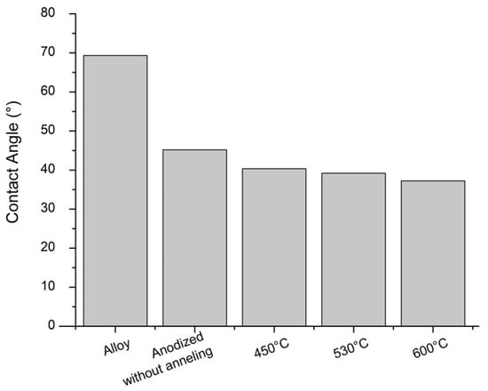 The wettability of the surface is an important parameter to evaluating ideal biomaterial. Metallic biomaterial to biomedical application demands a hydrophilic surface due to cell behavior. The result shows all surfaces hydrophilic (<90°), as seen in Figure 3. The nanostructured topography favors the surface to interaction with cells. Previous studies have shown the antimicrobial effect on the TiO2 nanotubular surface [7,16,30,39].
