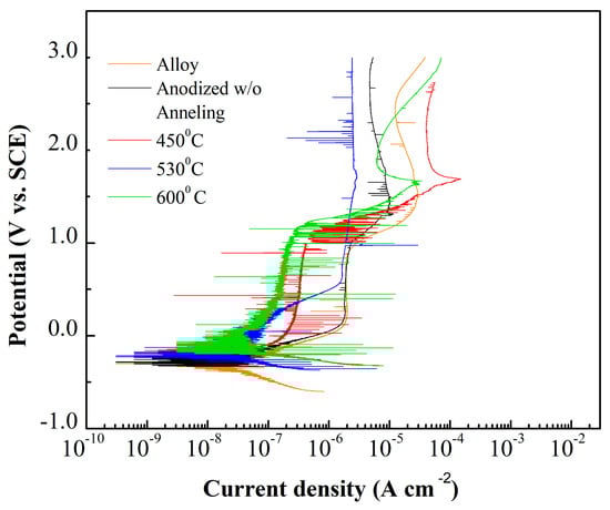 Figure 4 shows the potentiodynamic polarization curves obtained from Ti–Ta alloy before and after anodization process in 0.25% NH4F + glycerol at 30 V for 9 h. Previous and post annealing process performed at, 450 °C, 530 °C and 600 °C (5 °C/min) for 1 h. The polarization measurement evaluates the stability and intensity for passive oxide film formation. All condition exhibited typical spontaneous passivation characteristics [15,42,43].