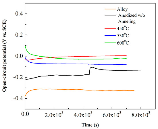 The open circuit potential (OCP) is the potential of working electrode relative to the reference electrode when no potential or current is being applied to the corrosion system. Therefore, OCP shows the tendency of metallic substrate to be subject in the electrochemical corrosion reactions. The electrolyte was 0.15 M NaCl + 0.03 M NaF, pH = 6, for 8000 s. OCP vs. time increases and reaches a stable value, consequently the investigated surface Ti–30Ta alloy, anodized without annealing, annealed at 450 °C, 530 °C and 600 °C had a noble behavior and it can resist to the electrolyte aggressive action, forming a protective film for the exposure time (Figure 5). The chemical surface analysis on the metallic substrates are useful to validate these conclusions that this material has great potential to biomedical application [23,30,43,44,45].