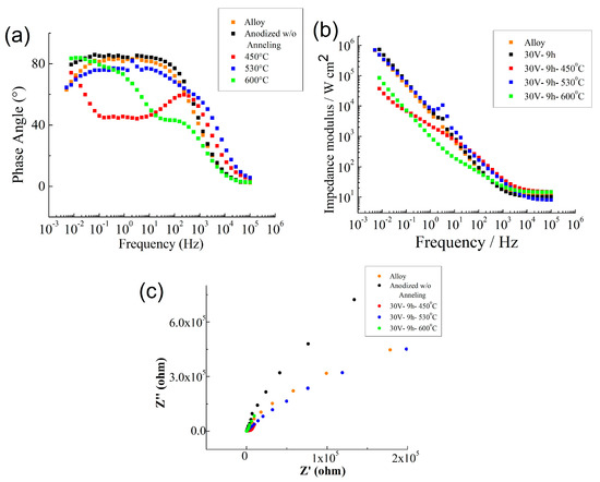 Then, in a complimentary analysis electrochemical impedance spectroscopy (EIS) evaluated the effect of annealing temperature on the capacitive response of the oxide film. Figure 6 shows representative Bode plots from 4 samples. All four conditions exhibited capacitive behavior over a wide range of frequencies. In the high frequency range, the spectra showed a flat portion due to the response of the electrolyte resistance. In the lower frequency the spectra revealed a linear slope which is indicative of the capacitive characteristics of a passive film. The impedance response, described by the equivalent circuit (EC) model can be used to describe the capacitive behavior of Ti–30Ta alloys before and after anodization process and also on three different temperature of annealing; 450 °C, 530 °C and 600 °C [24,45,46].